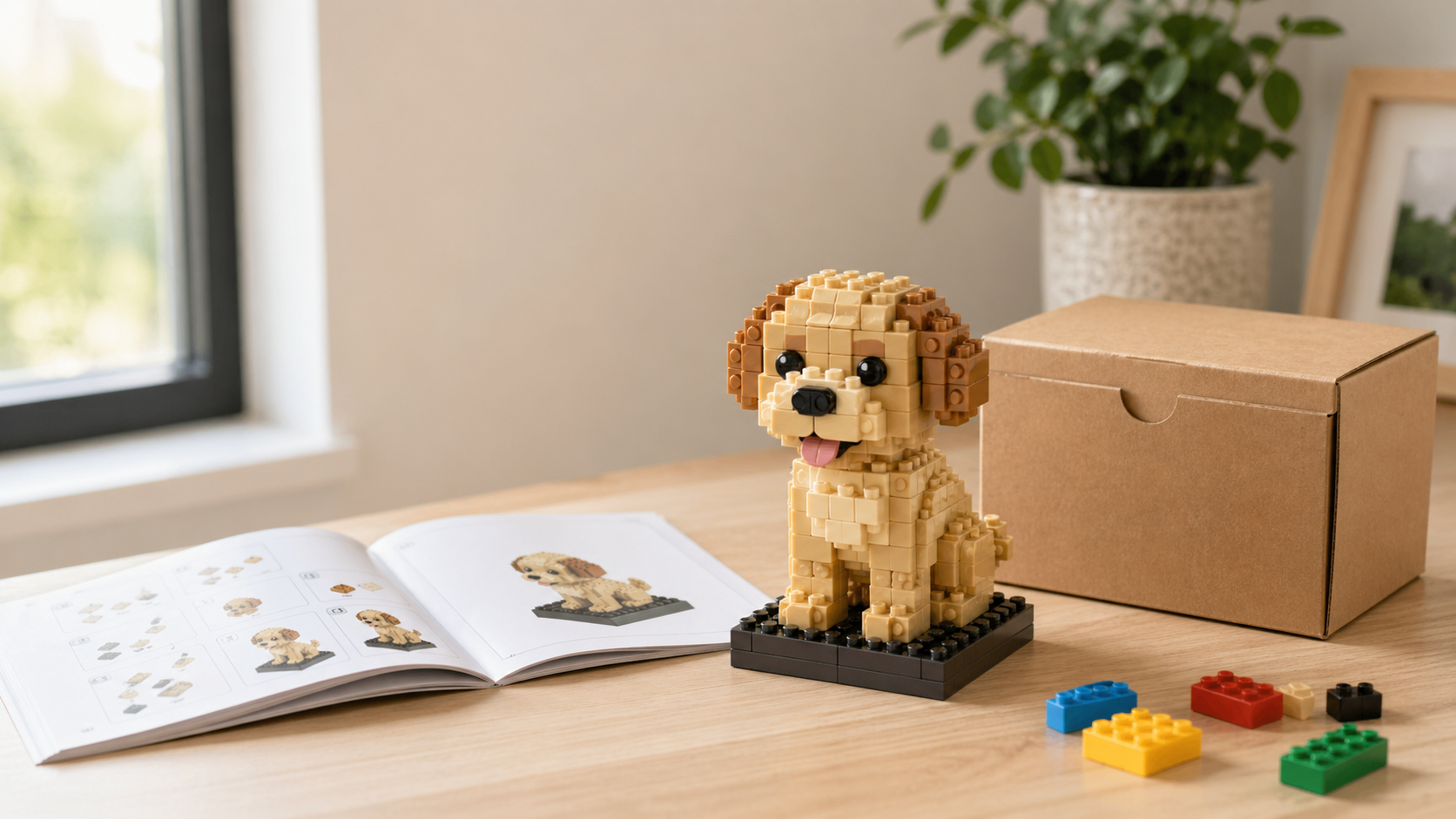 Turn a favorite pet photo into a small buildable brick model, with instructions, a parts list, and an optional gift-box kit.